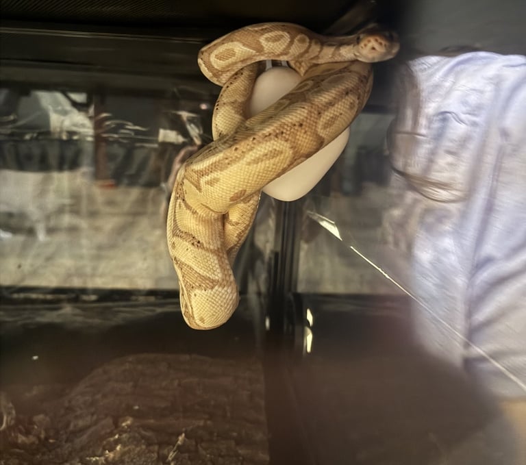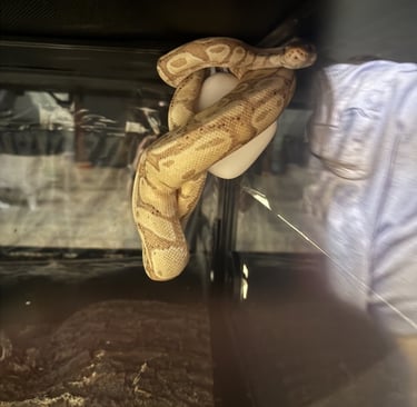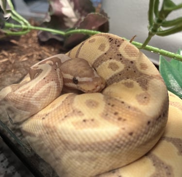 Oh boy, I said it. Everyone’s favorite noodle with the boopable snoot. Who can say no to that puppy-dog face? I know I couldn’t, so we picked one up at a show in 2024. There were hundreds of ball pythons at this show, but I found him: a banana morph male ball at a good price. After showing, the guy informed me that he is from a 2023 clutch that hasn’t sold yet, so he discounted him even more. I got to hold the little yellow ball, and it was fine. He stayed in a ball the entire time (balling up is a defensive behavior when they feel threatened), which is totally understandable.