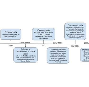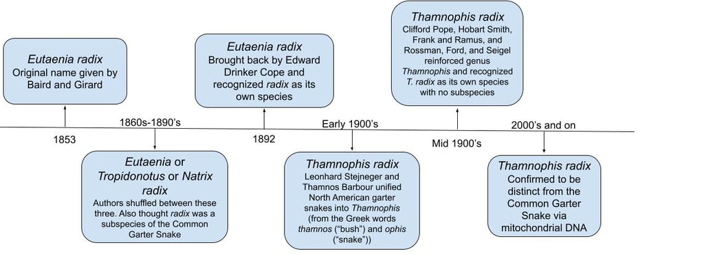 The Plains Garter Snake, Thamnophis radix, was first described by Spencer Fulklerton Baird and Charles Frédéric Giard in 1853. Its naming history is quite the roller coaster! Check out the timeline below to learn about it!